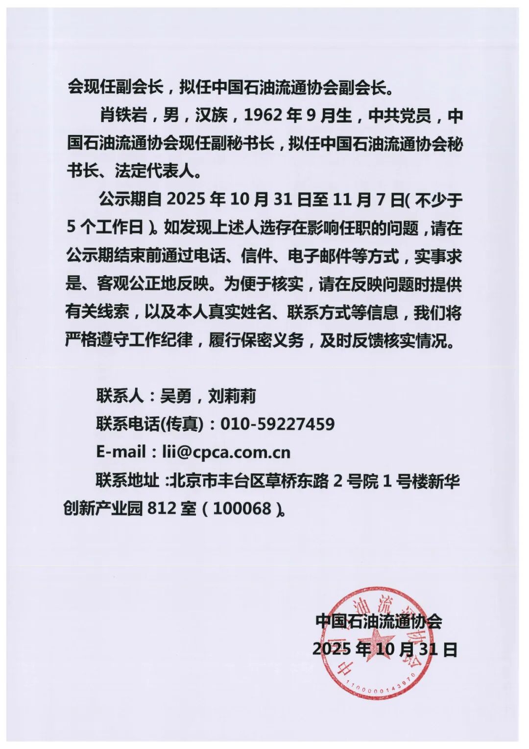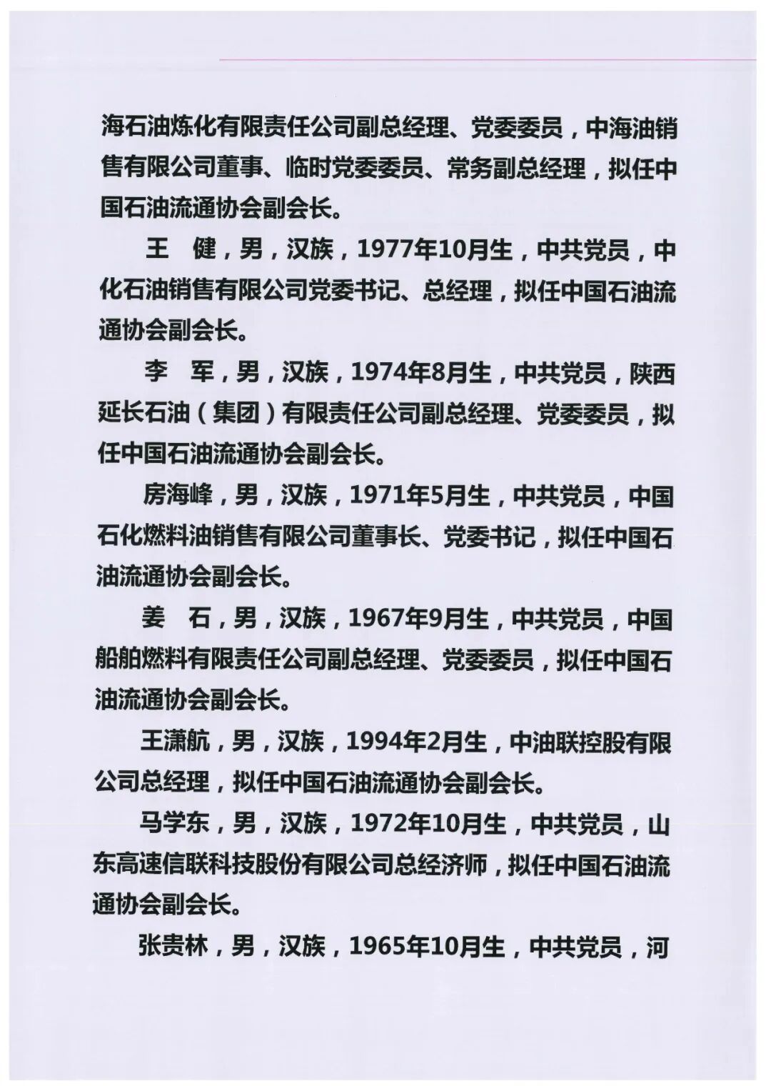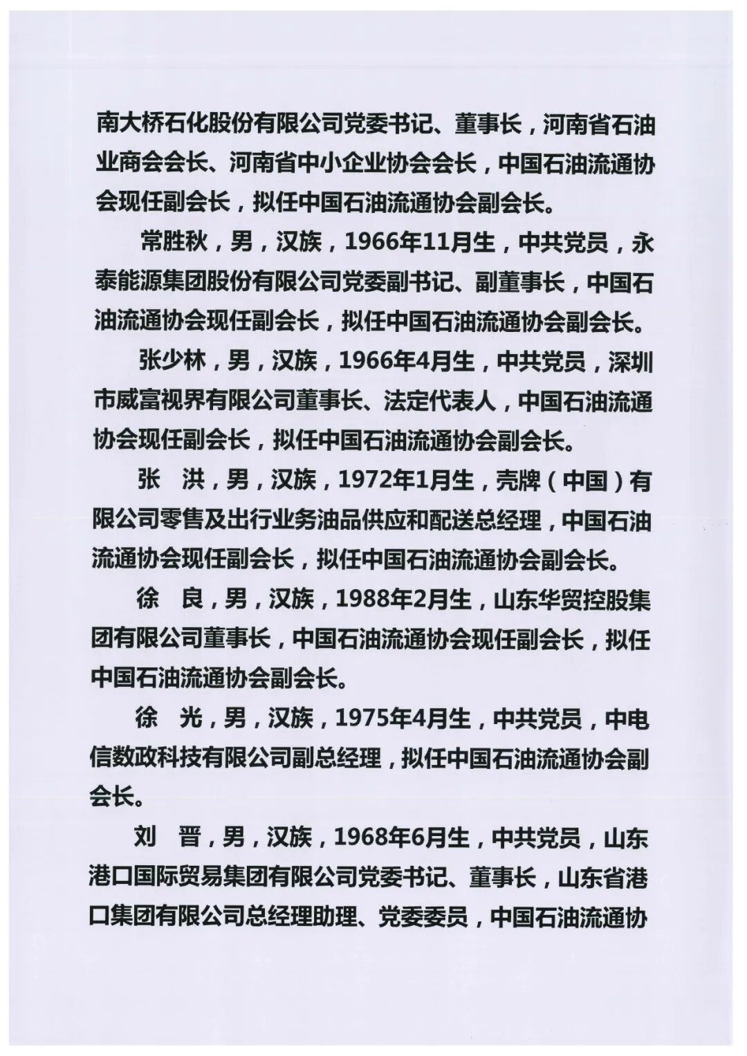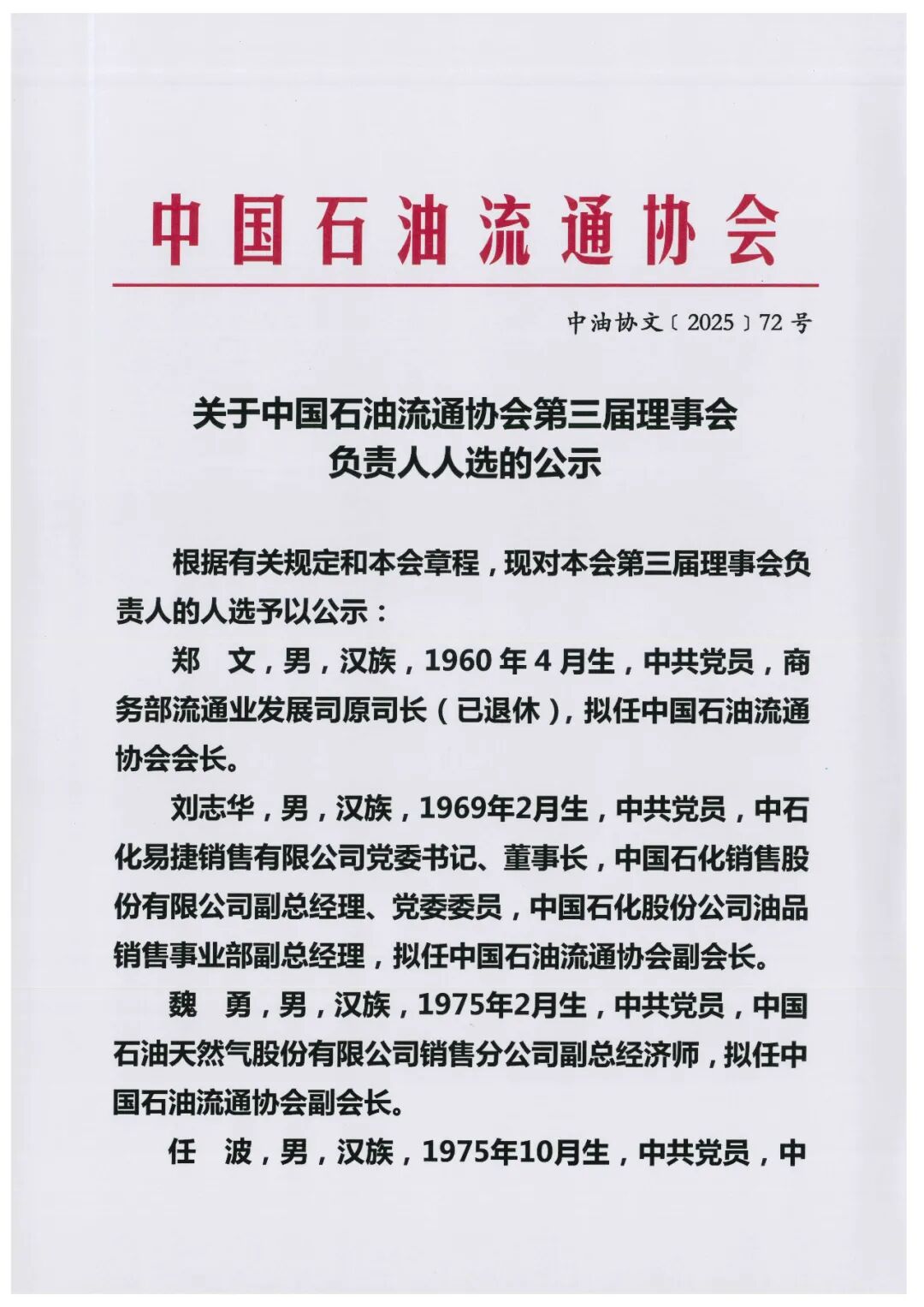 关于中国石油流通协会第三届理事会负责人人选的公示