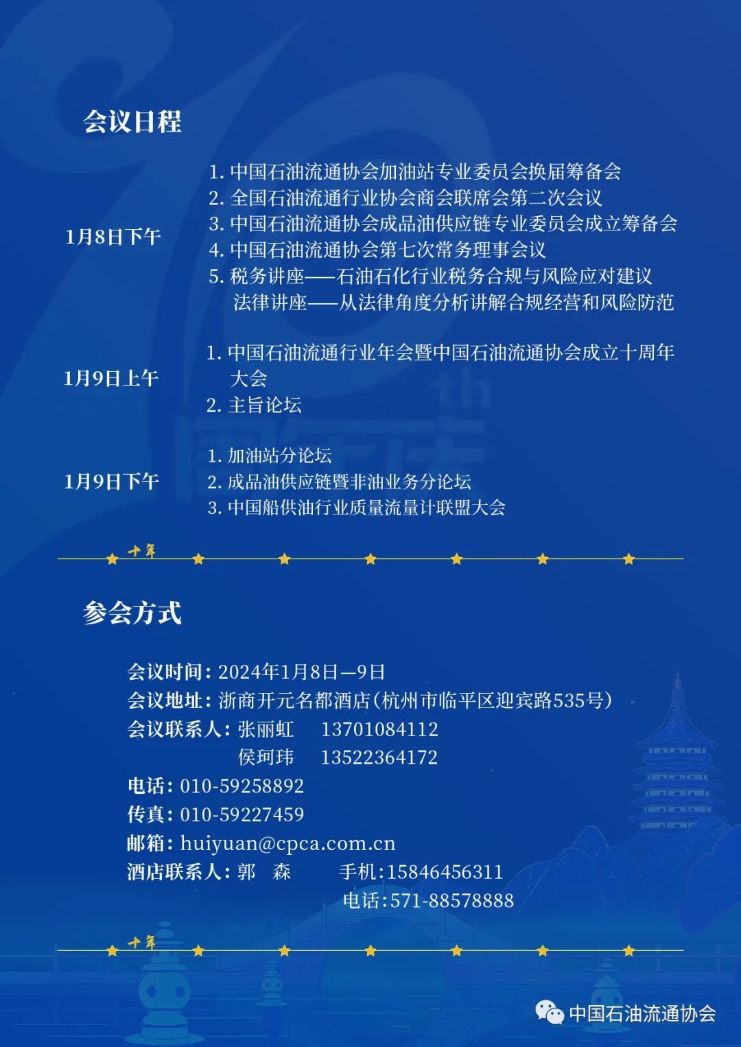 中国石油流通行业年会暨中国石油流通协会成立十周年大会将于2024年1月8日—9日在杭州召开