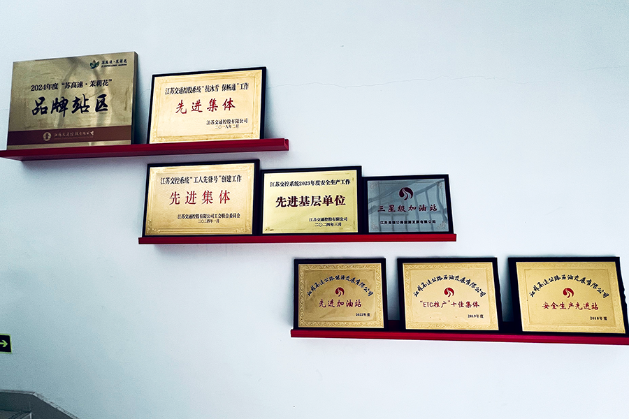 凭借卓越的综合表现该站先后荣获2024年度江苏交控“苏高速・茉莉花”品牌站区,2024年度“工人先锋号”先进集体,2023年度交通控股安全生产“先进基层单位”,2022年度江苏高能“先进加油站”、“三星级加油站”等荣誉;参与创建的“青橙青创小组”获交通控股青年创新奖。